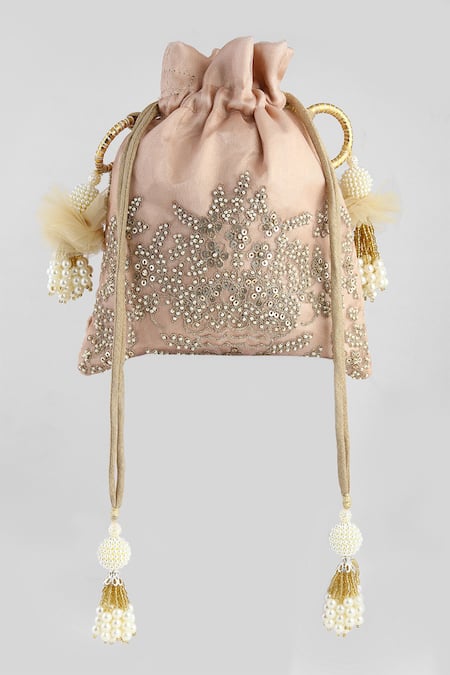Peach potli bag featuring hand embroidered sequin embellishments, zardozi-pearl work, and bead tassels