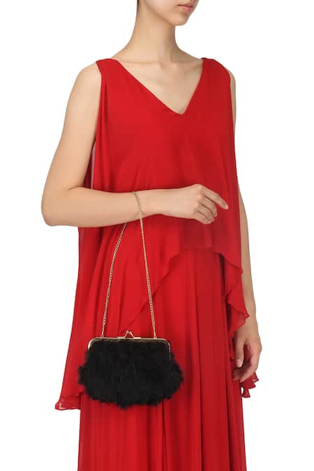Black Fabric Flowers Velvet Fur Clutch With Sling