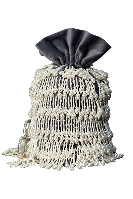 Grey Pearls, Beads Velvet Tassel Potli Bag