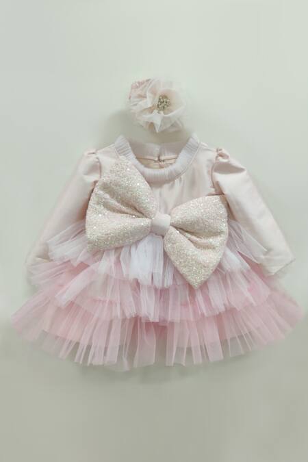 Powder pink layered dress featuring a frill neckline and a large sequin embellished bow