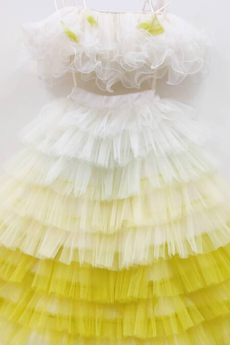 Off white and yellow lehenga featuring layered tulle design. Paired with a ruffle blouse with tie-up sleeves.