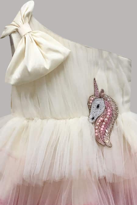 Oversized bow detail on shoulder, Placement embellished unicorn motif, Layered tulle skirt with pink gradient