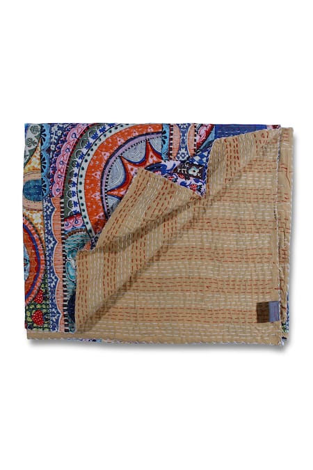Multicolor rectangle shaped bedspread with abstract print & kantha stitchline embroidery.
