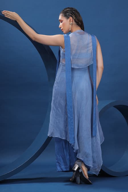 Blue Shirt 38g Pure Organza Silk Hand Embroidered Kurta And Palazzo Set