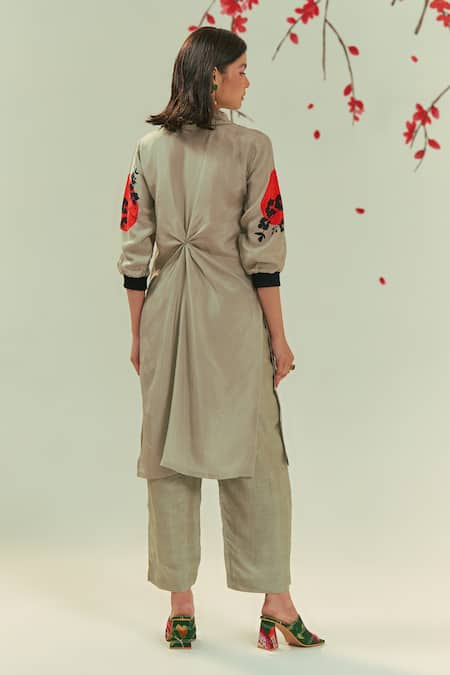 Olive green tunic top featuring three fourth puffed sleeves, a spread collar neckline, and Ikigai bloom print. Paired with coordinating pants for a complete look.