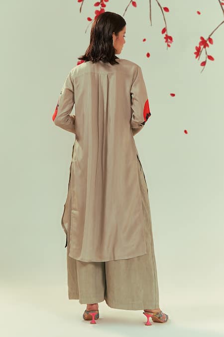 Olive green tunic top featuring a Mandarin collar, full sleeves, and Ikigai print. Paired with flared pants that include side pockets and an attached inner lining.
