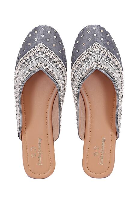 Grey mules featuring intricate embellishments of thread, sequin, cutdana, and beads