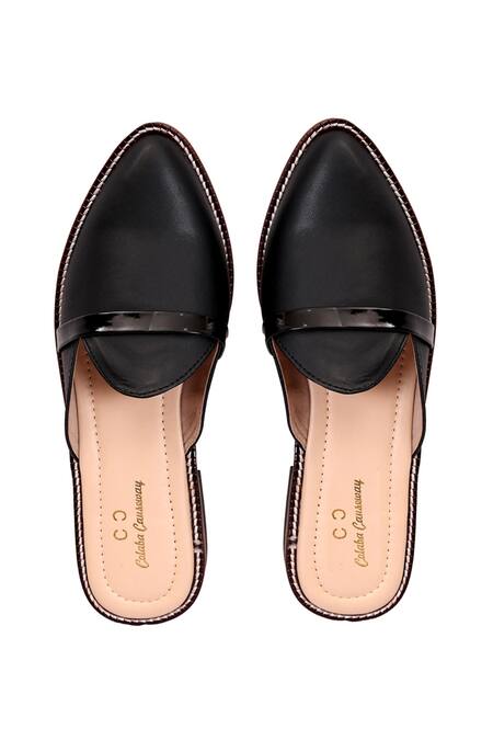 Black mules featuring stitchline thread embroidered border and pointed toe detailing