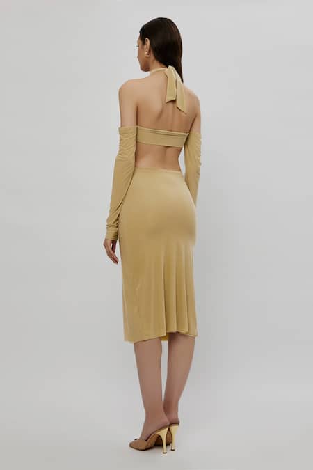 Beige Malai Lycra High Neck Cold Shoulder Bodycon Dress