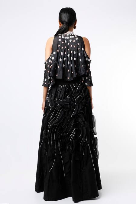 Black cold-shoulder cape-blouse with all-over floral motifs. Comes with textured lehenga.