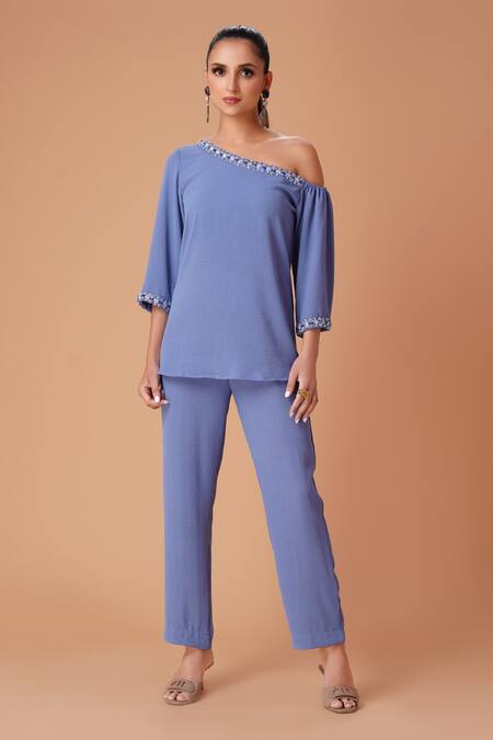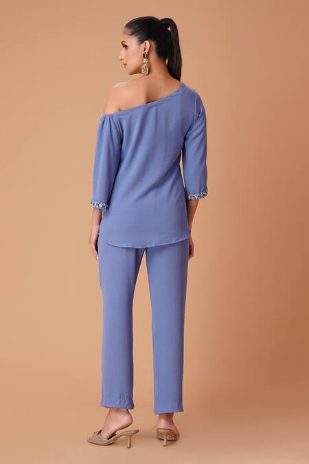 Blue Crush Lycra Embellished Asymmetric Cold Shoulder Top And Pant Set