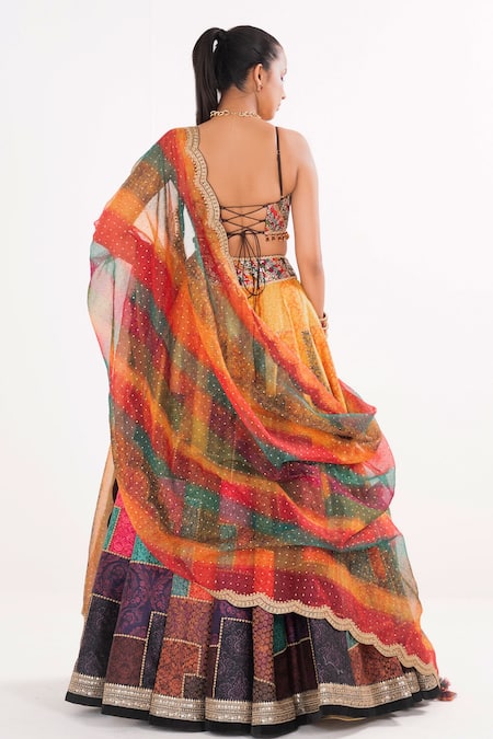 Multi color collage pattern lehenga crafted in brocade featuring dori embroidery. Paired with an embroidered padded blouse and a printed dupatta with scallop borders.