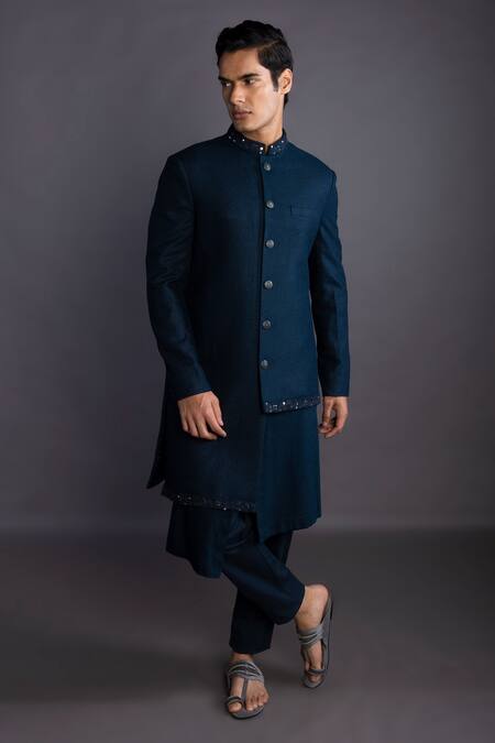 Blue high low hem jacket featuring embroidery on the collar and hem. Paired with a kurta and pant made from Katan silk and cotton lycra.