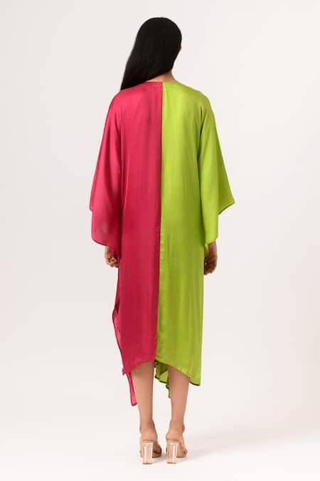 Buy_Neora By Nehal Chopra_Green Sustainable Silk V Neck Color Block Kaftan _Online_at_Aza_Fashions