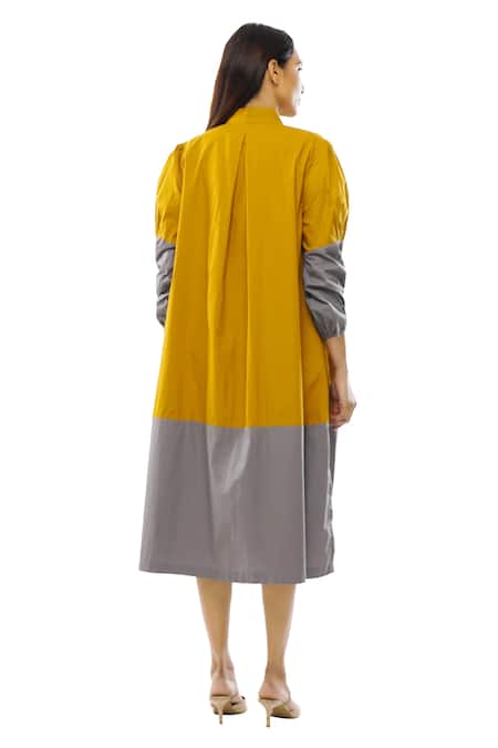 Buy_Khat_Yellow Cotton Mandarin Collar Color Block Poplin Dress _at_Aza_Fashions