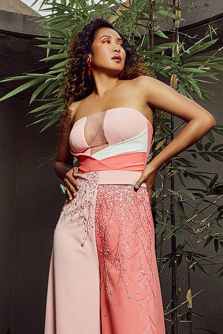 Coral dual-tone colorblock bandeau jumpsuit with sheer neck panel, placement floral motifs & embellished sequin- glass bead.