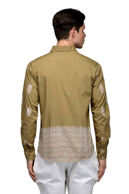 Khaki colorblock shirt with contrast floral printed motifs & cuff sleeve hem.