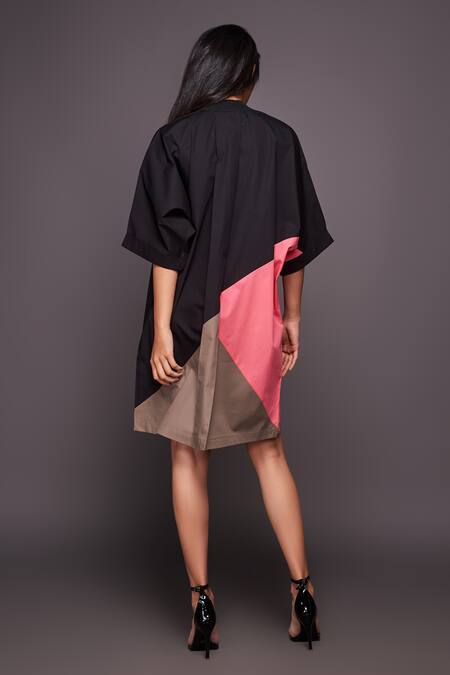 Black & pink dress with color block panels, flared sleeves & mandarin collar.