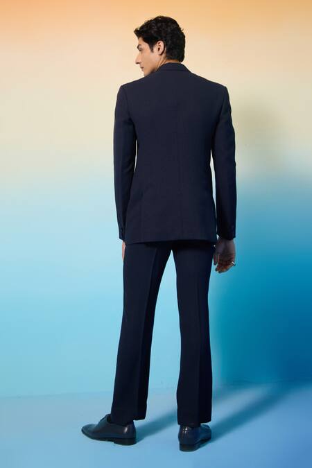 Blue textured double breasted blazer featuring a collared neckline and full sleeves. Paired with matching pants for a complete look.