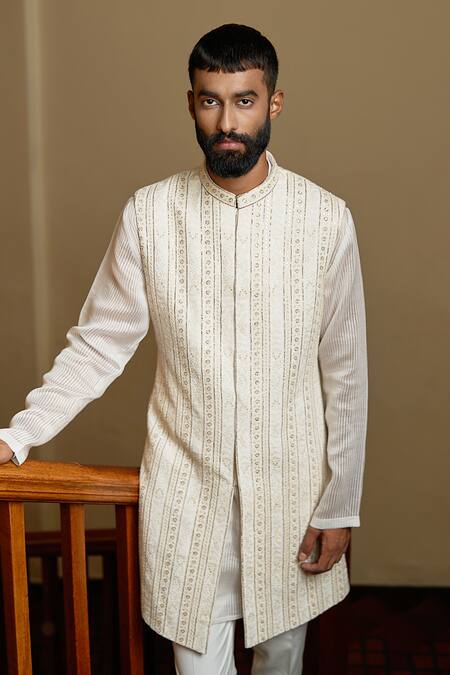 Off white sleeveless sherwani with floral chikankari work. Paired with kurta & pant.