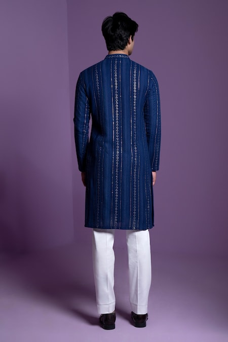 Blue kurta featuring delicate chikankari embroidery with sequin embellishments. Paired with a white pant for a complete look.