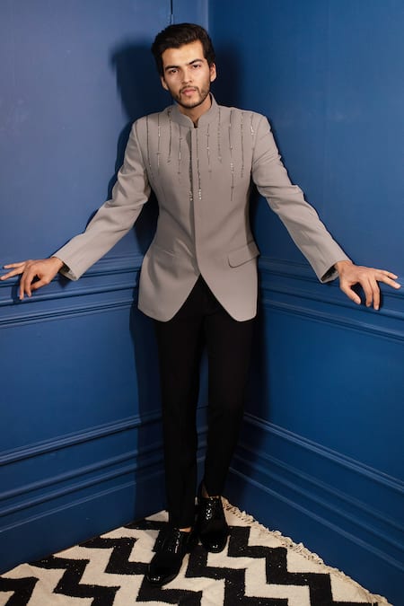 Grey bandhgala with embroidery on bodice & flap, welt pocket. Paired with black pant.