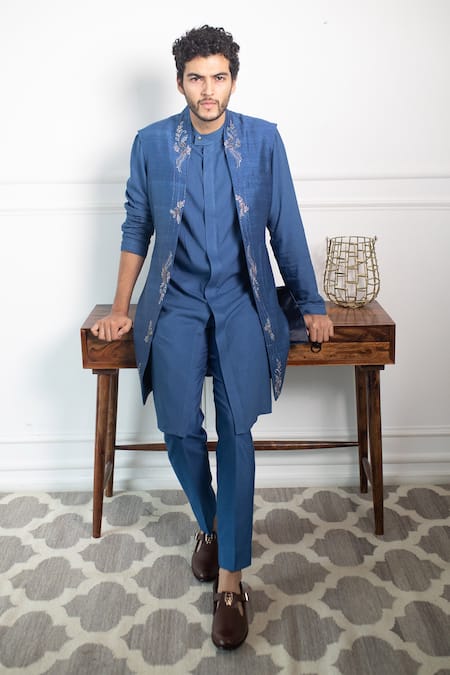 Indigo blue jacket with floral embroidered motifs. Paired with textured raw silk pintuck kurta & pant.