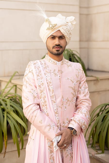 Peach achkan style sherwani with floral embroidery in dabka , resham & zardozi work. Paired with kurta, pant & embroidered stole.