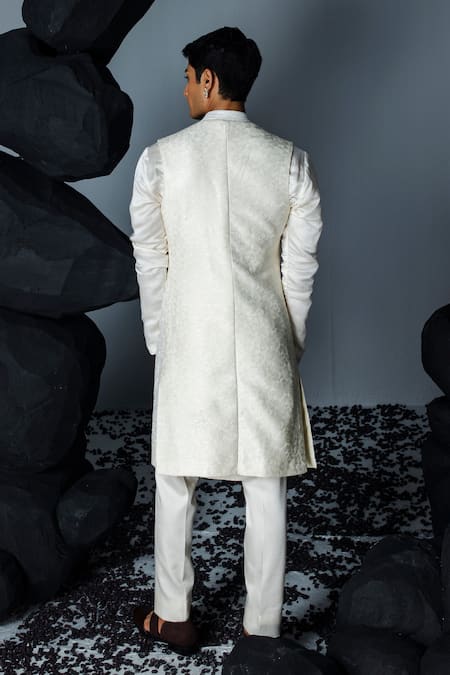 Ivory silk sleeveless sherwani featuring crystal embellished geometric patterns. Paired with an embroidered kurta and pant.