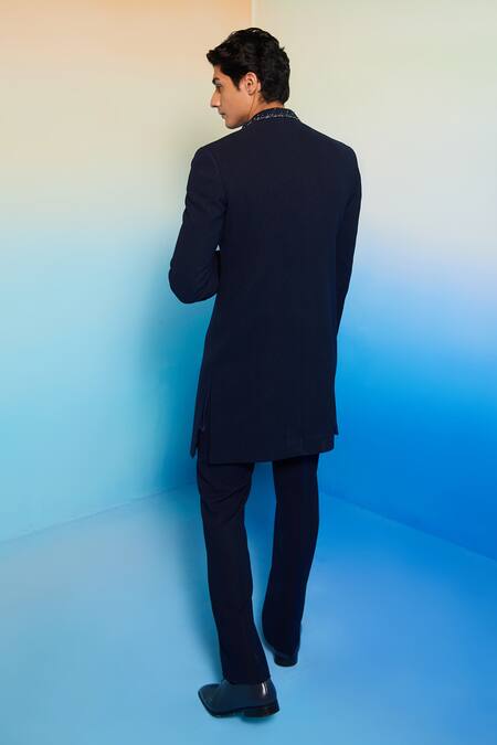 Deep blue textured sherwani featuring metallic crystal embellishment on the collar. Paired with a matching kurta and pant.