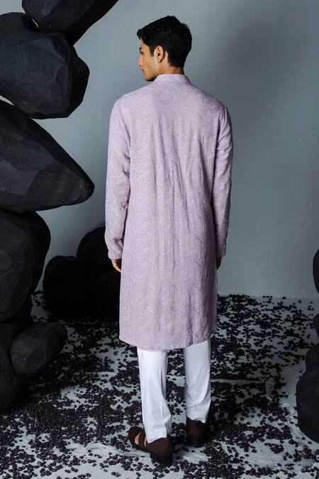 Purple kurta featuring thread embroidered foliage patterns and a mandarin collar. Paired with matching pants in a straight silhouette.