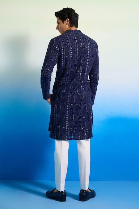 Blue kurta featuring resham and gold sitara embellishments in a stripe pattern. Paired with matching pants for a complete look.