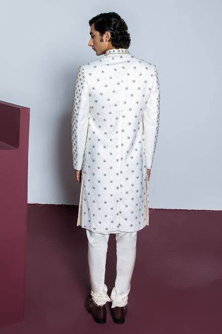 Ivory sherwani featuring zardosi embroidery with resham knot details. Paired with a matching kurta and pant.