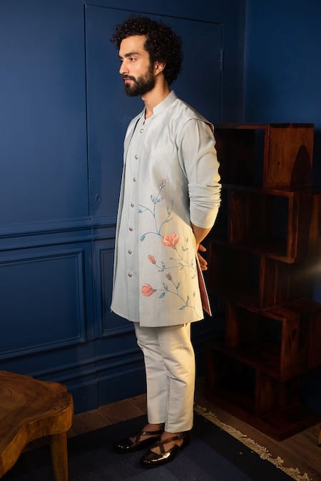 Blue jacket with placement embroidery & floral hand-painted motifs. Paired with kurta & pant.