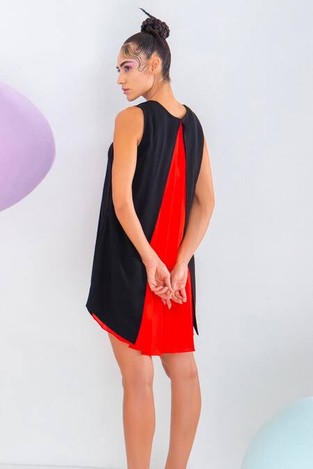 Black sleeveless A-line flare dress featuring a peekaboo red panel at the back