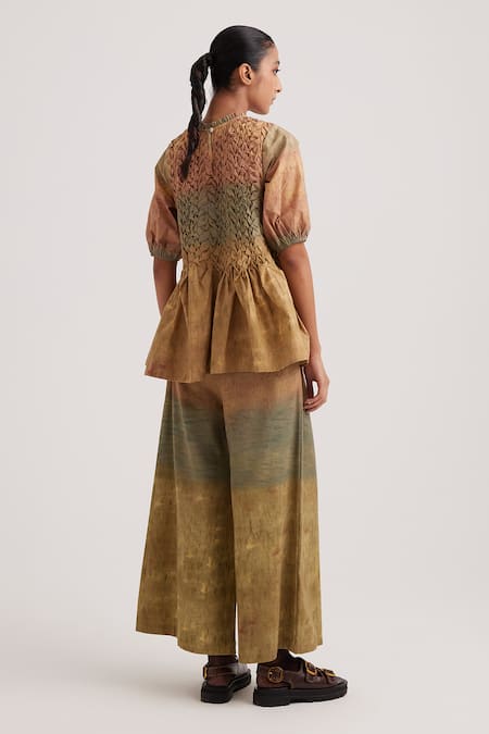 Brown peplum top featuring impression hand-painted print with smocking on the yoke and ruffled high neckline