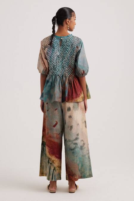 Multi color peplum top featuring valley hand-painted print with smocking on the yoke and ruffled high neckline