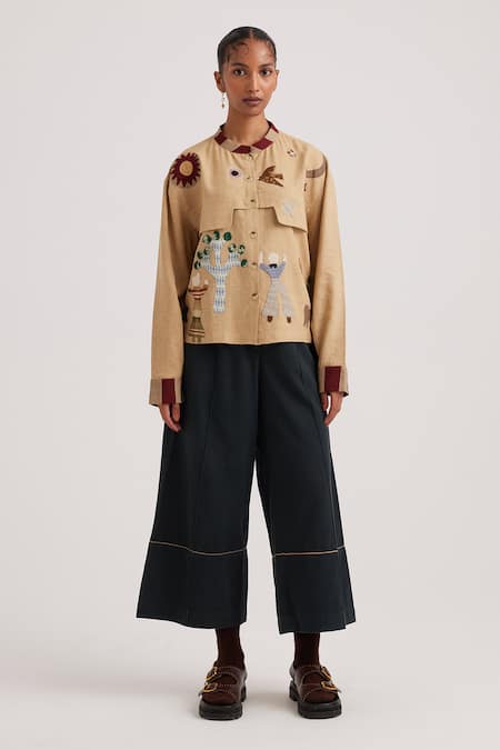 Beige shirt featuring folk applique embellishment with color-block panels on the neck & cuff