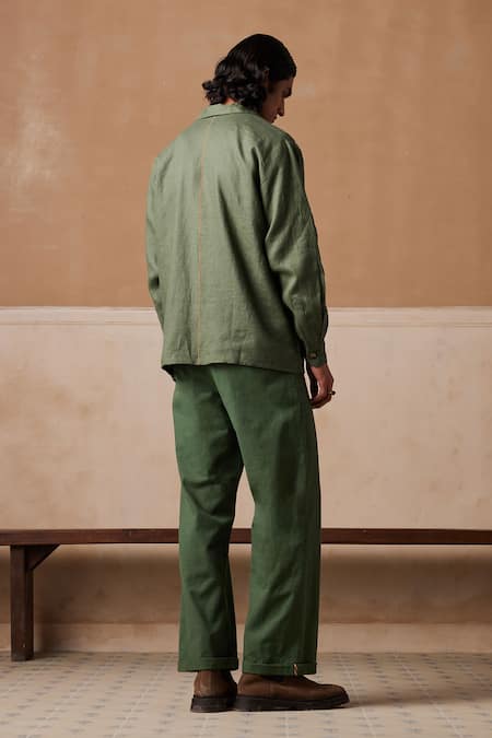 Green shacket made in 100% linen featuring smocked details on the pocket and hand embroidered floral motif. Comes with matching pant.