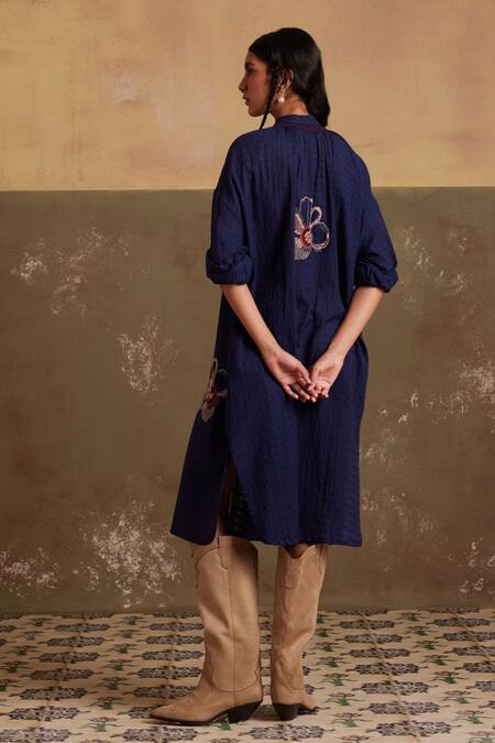 Blue Cotton Embroidery Bandeau Neck Thread Placement Kaftan Shirt Dress