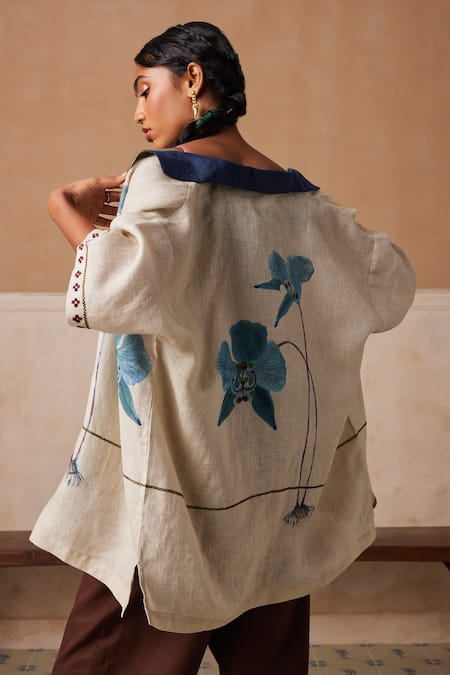 Ivory Linen Embroidery Collared Day Flower Print Shirt