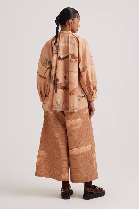 Brown Cotton Satin Bandeau Neck Derby Print A-line Shirt