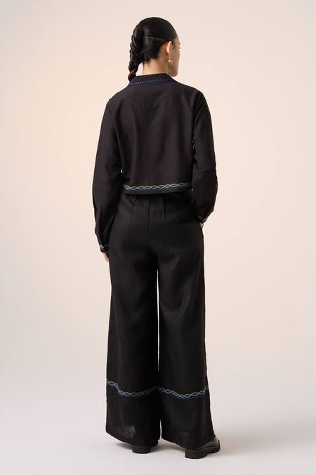 Black Cotton Applique Collared Duck Detailed Crop Shirt