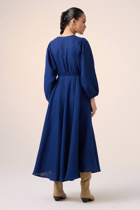 Blue Linen Embroidery Round Neck Emma Rose Dress