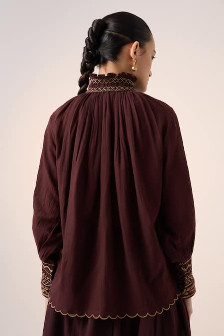 Maroon top featuring pixel embroidered floral vine motifs and smocked details