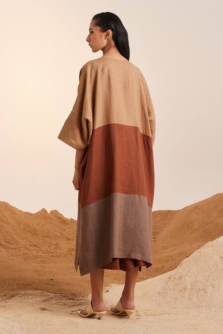 Brown colorblock cape featuring flared sleeves and an open neckline