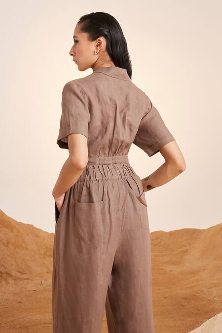 Brown linen crop top featuring a notched lapel collar and half sleeves