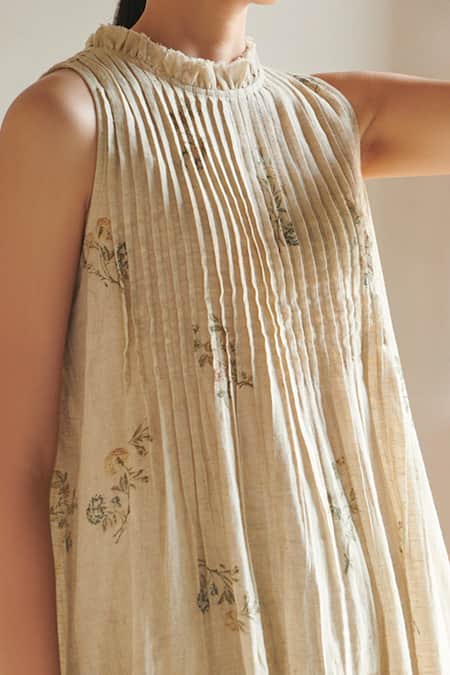 Ivory kurta with all-over floral block print, pintucked yoke, frill detailing at the neckline and sleeveless.