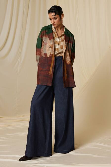 Blue denim flared pant featuring a pleated front and semi-elasticated waistband