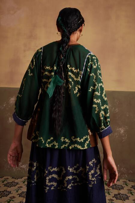 Emerald green cotton top featuring a round neckline and puffed sleeves